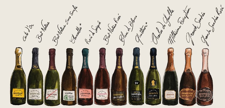Parmi les cuvées emblématiques de la maison, on retrouve notamment Carte d’Or, Brut Nature Sans Soufre et Grande Sendrée, véritables références du savoir-faire Drappier.